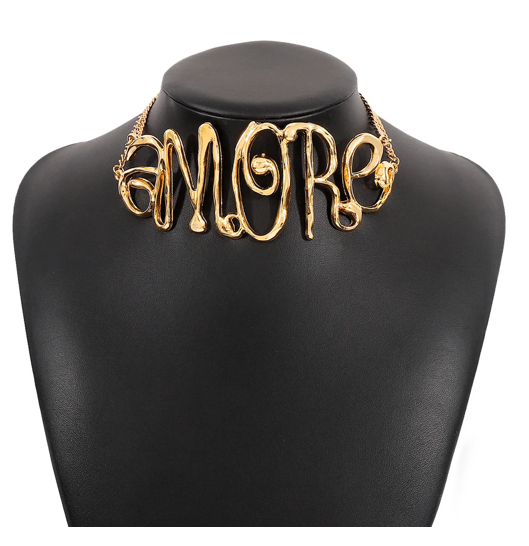 Make a bold statement with the Amore Choker Necklace, a stunning piece of wearable art. This chunky, eye-catching design spells out “Amore” the Italian word for “love” in an abstract font that adds playful charm and elegance. Perfect for wearing solo to elevate any outfit with personality.