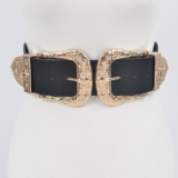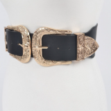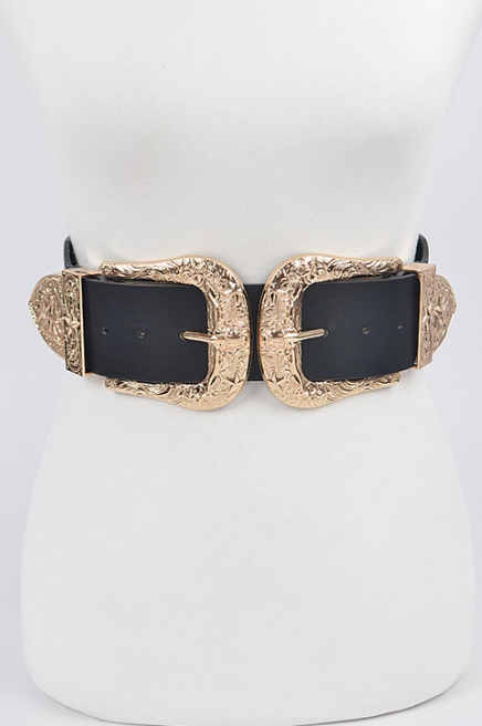 Two gold big buckles plus size belt with a wide stretchy back band.