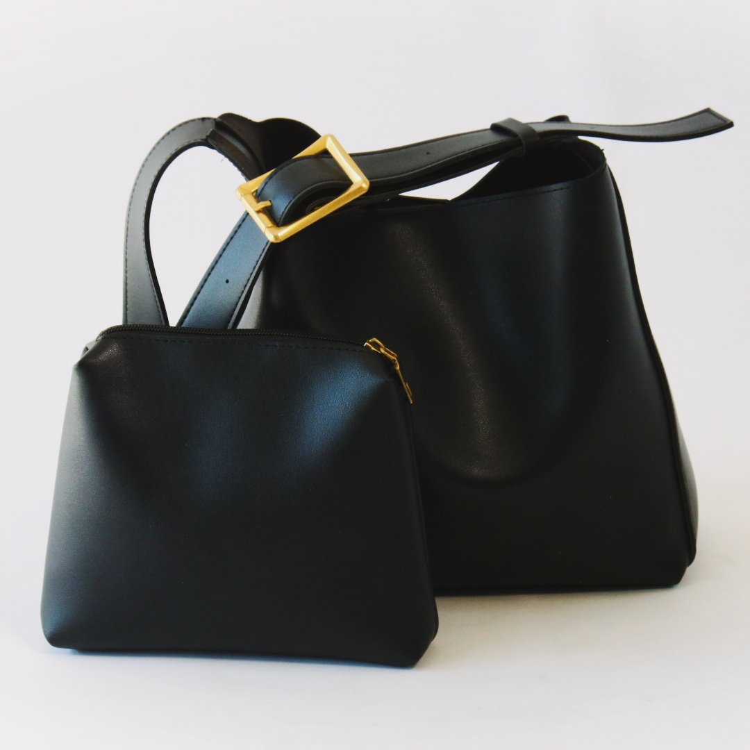 This sleek and minimalist bucket bag is crafted from smooth, high-quality Polyurethane (PU) leather with a structured silhouette and subtle sheen. It features a wide adjustable shoulder strap with a polished gold buckle for a refined touch and a magnetic buckle. Paired with a matching detachable zippered pouch… perfect for organizing smaller essentials. Whether you’re heading to work, brunch, or an evening out, this duo offers both function and timeless style.