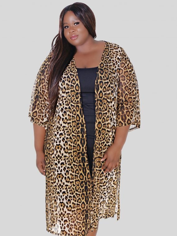 A chic and lightweight mesh kimono top featuring an allover leopard print design. It has an open-front style with slits on both sides, adding movement and versatility. Perfect as a layering piece to elevate casual outfits or as a stylish cover-up.