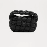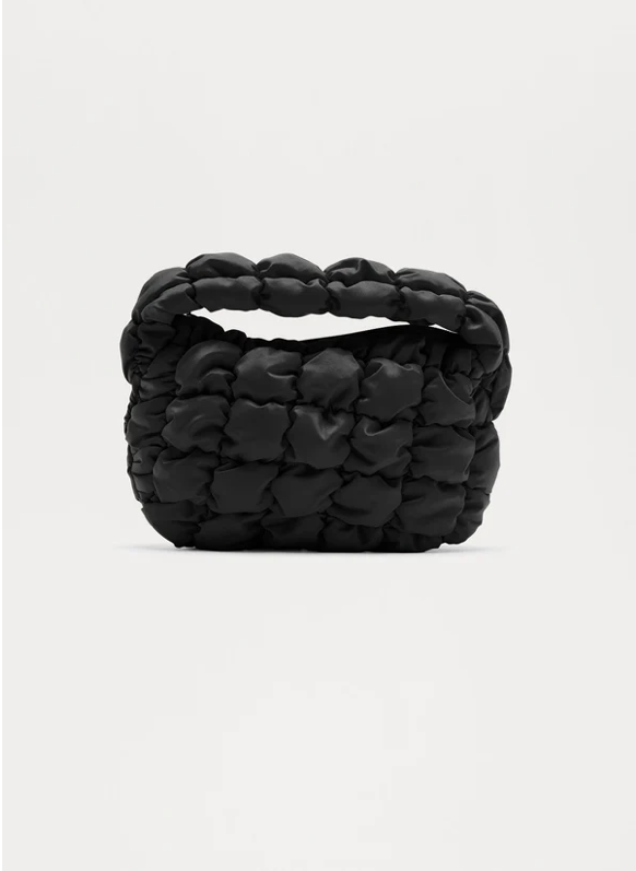 This is a chic and contemporary black mini handbag featuring a puffy, quilted design. The soft, cloud-like texture gives it a modern and playful appeal, making it a stylish accessory for both casual and upscale outfits. Its compact size and sturdy handle add to its charm, perfect for carrying essentials with ease.