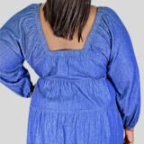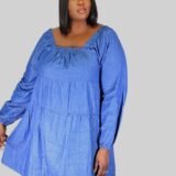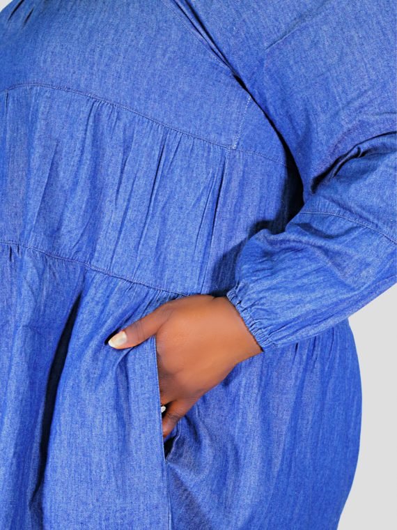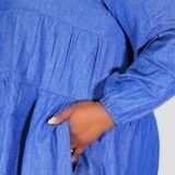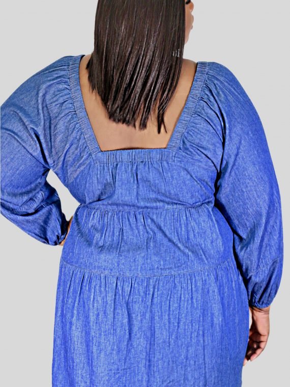 This is a soft cotton denim mini dress featuring a square neckline and a tiered silhouette for a relaxed, feminine look. It includes two practical pockets, voluminous sleeves gathered at the cuffs and shoulders, adding a touch of elegance and comfort to the design. Perfect for casual outings or effortless everyday style.